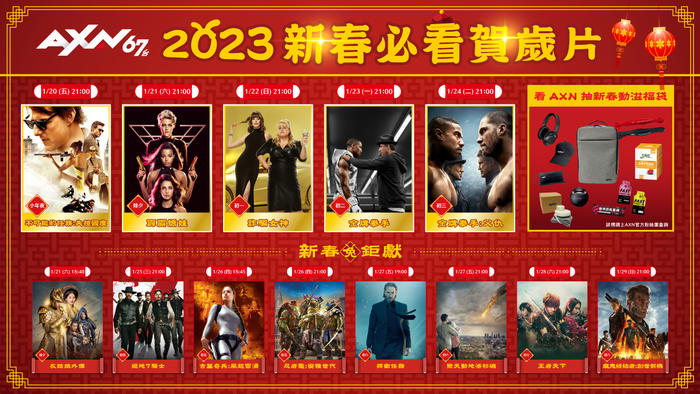 2023新春AXN 67頻道準備了史上最經典的間諜動作片《不可能的任務:失控國度》、《不可能的任務:鬼影行動》,還有精選多部強檔電影:《霹靂嬌娃》、《詐騙女神》、《金牌拳手》、《金牌拳手II:父仇》、《絕地7騎士》、《忍者龜:變種世代》、《王者天下》、《魔鬼終結者:創世契機》、《灰姑娘外傳》等,快鎖